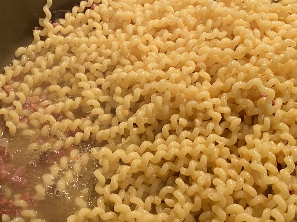Add semi-cooked pasta plus 1 and 1/4 cup of the hot pasta water to the pancetta and cook for the remaining 2 minutes, tossing regularly.