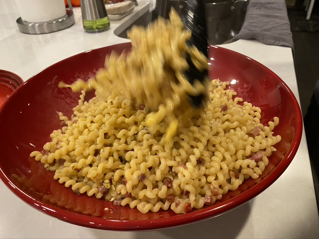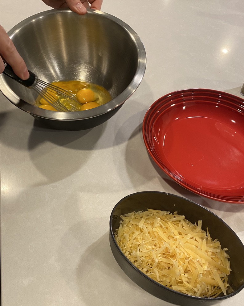 Carefully stage the kitchen: place pasta bowl in oven at 200° and prepare the kitchen counter where the pasta will eventually be combined with the eggs.