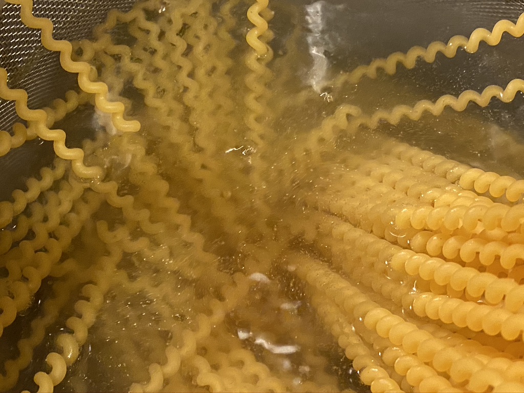 Remove pasta from water when the time reaches 2 MINUTES LESS than directions suggest. Be careful to save some pasta water when draining the noodles.