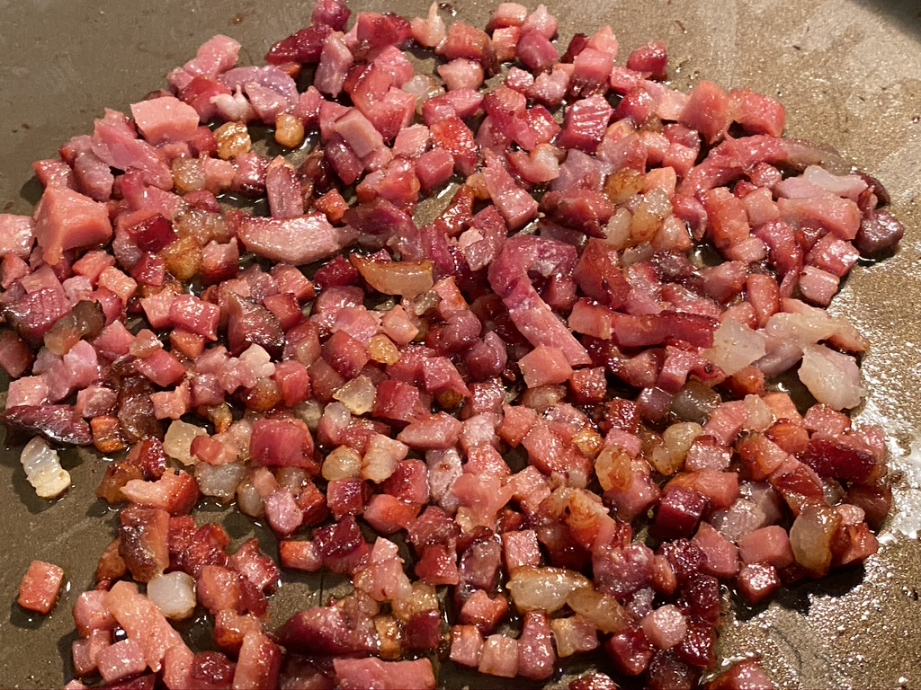 While the pasta water is heating, in a frying pan (deep enough to eventually add the pasta), sauté pancetta on medium heat to a nice golden brown.