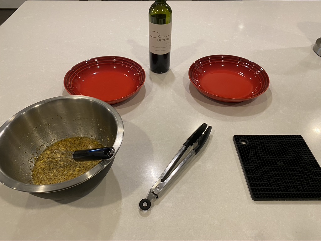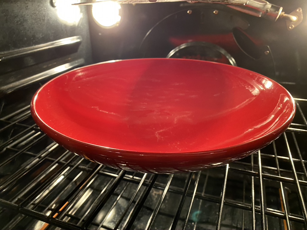 Quickly … remove hot pasta bowl from oven, set on counter in the staged final prep area.