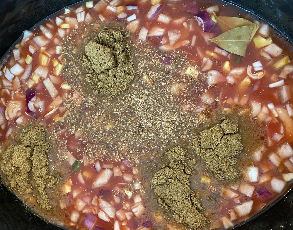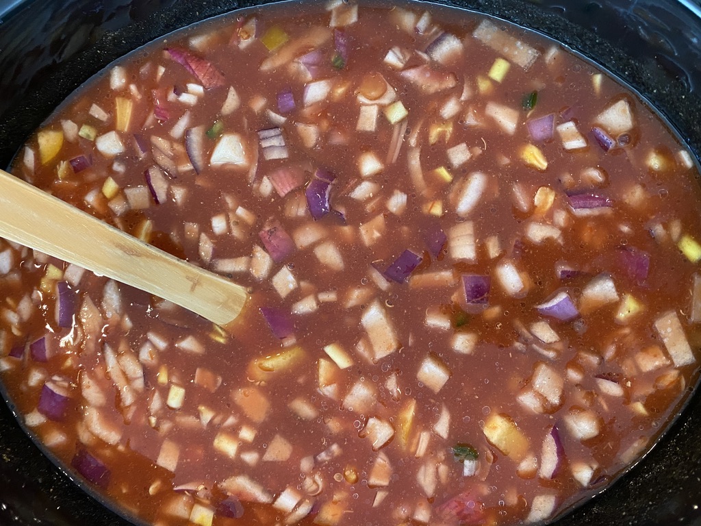 Rinse, chop, and combine all of the ingredients into a slow cooker.
