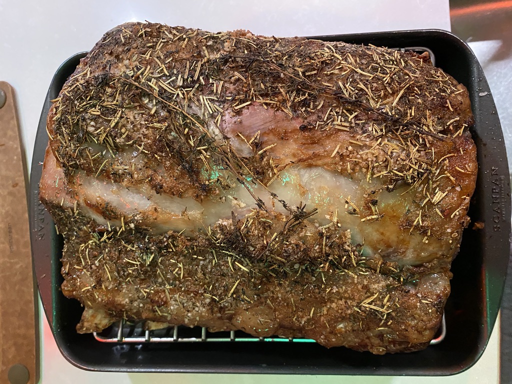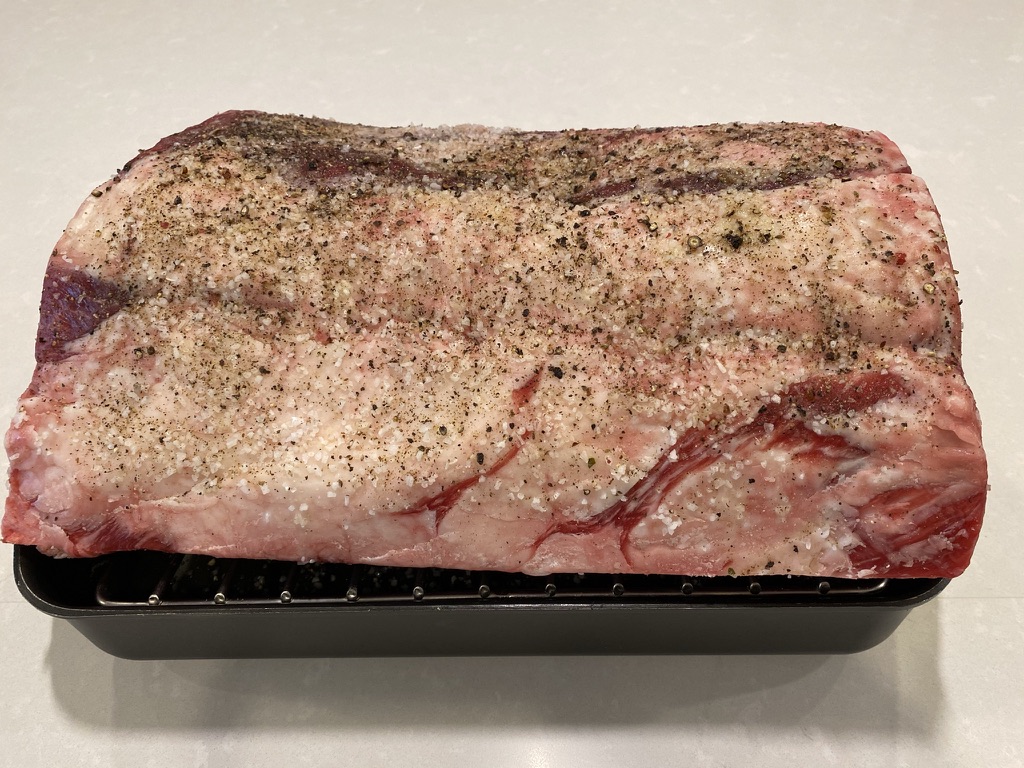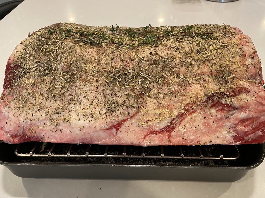 The day before … remove the roast from all packaging, rub with salt and pepper, pressing hard to grind the large, coarse salt crystals into the top layer of fat, then refrigerate completely uncovered overnight.