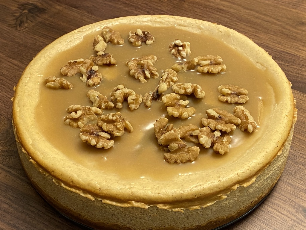Dashing had more than just Peter Porte and Juan Pablo Di Pace as eye candy. During the first ad break, a commercial running at Tik Tok speed transformed a block of Philadelphia Cream Cheese into a glorious maple walnut cheesecake. After the movie ended we found the video streaming on the Kraft Foods Facebook page and took notes. Head there if you want to try the movie version, the recipe below is slightly modified … I’m not a huge fan of walnuts so toned down their contribution and took a few lazy shortcuts, notably replacing pre-baking the crust with a short stint in the freezer.