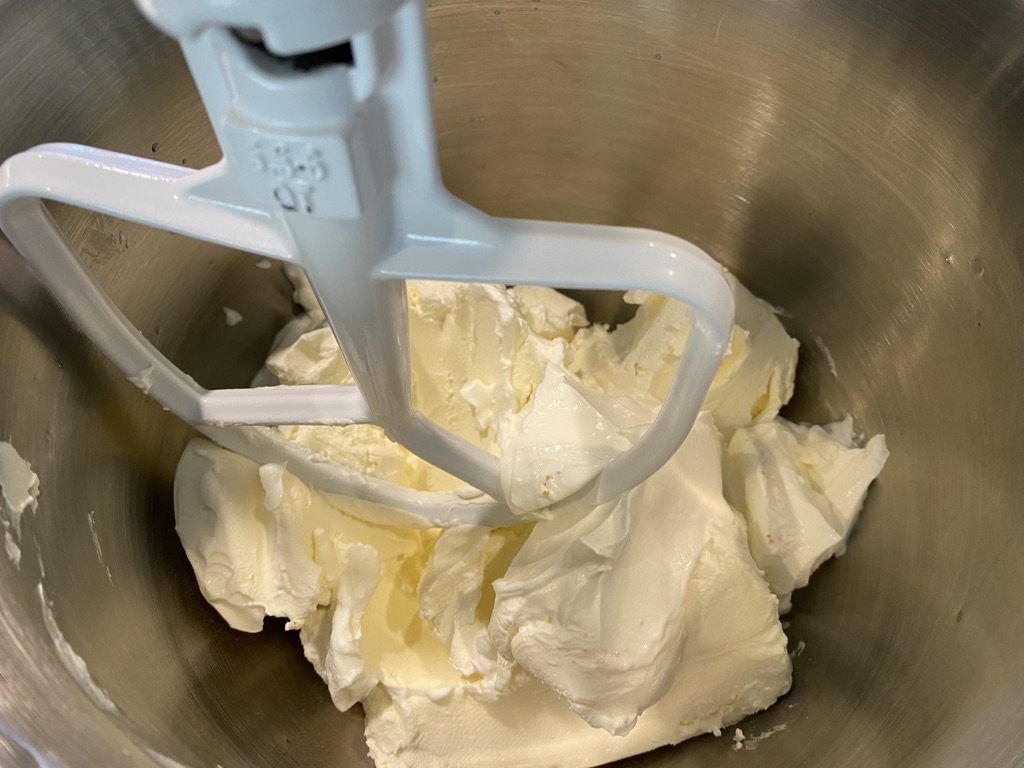 On a slower speed, combine each brick of cream cheese separately until nicely blended.
