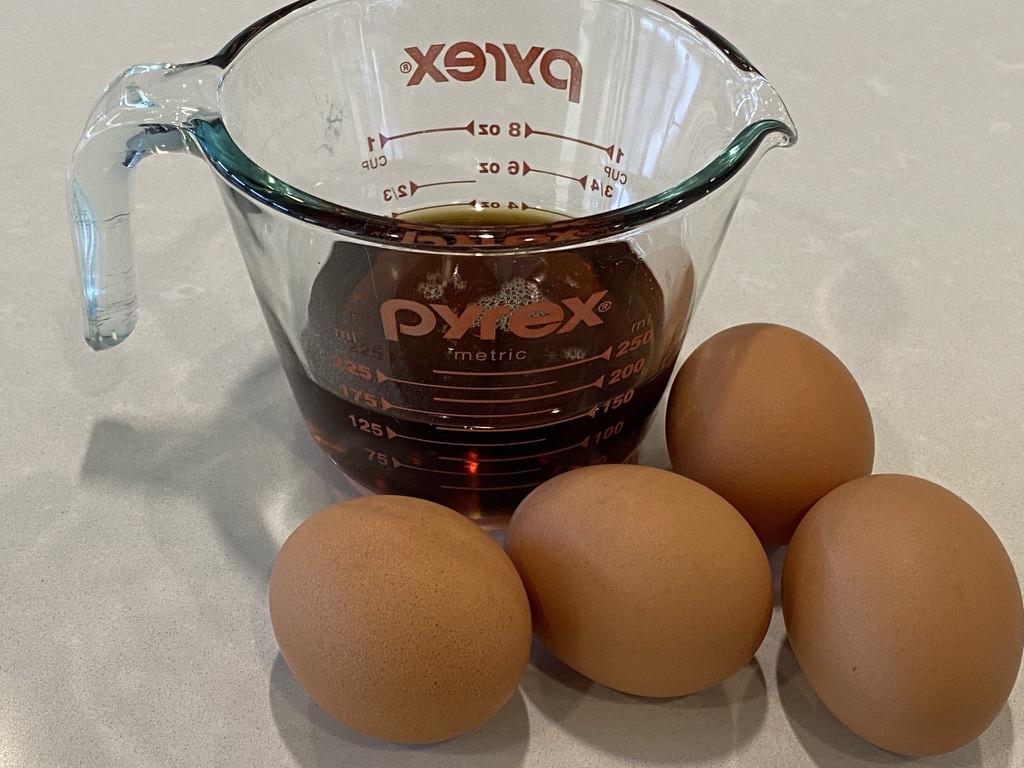On the side, in a separate mixing bowl, break 4 eggs and whisk together into the maple syrup. A mixing bowl with a pour spout is handy here. Slowly pour this into the cream cheese filling as the mixer is running on a low speed. Continue to increase mixing speed until well blended.