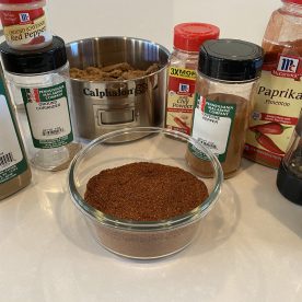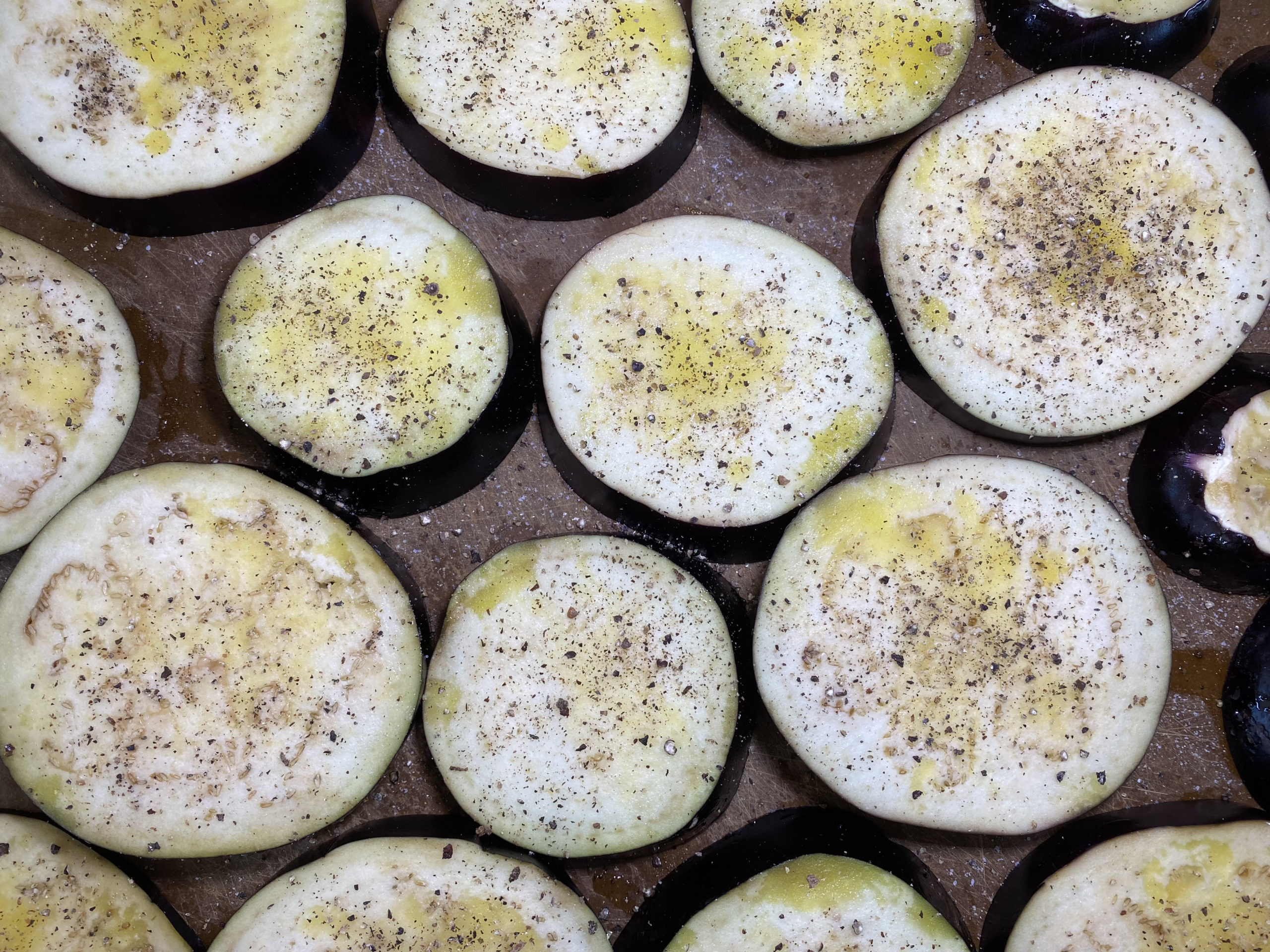 Slice the Eggplant into 1″ to 1/5″ thick, round slices. In a small bowl, blend salt, pepper, and italian spice blend with olive oil then brush it on both sides of the eggplant.