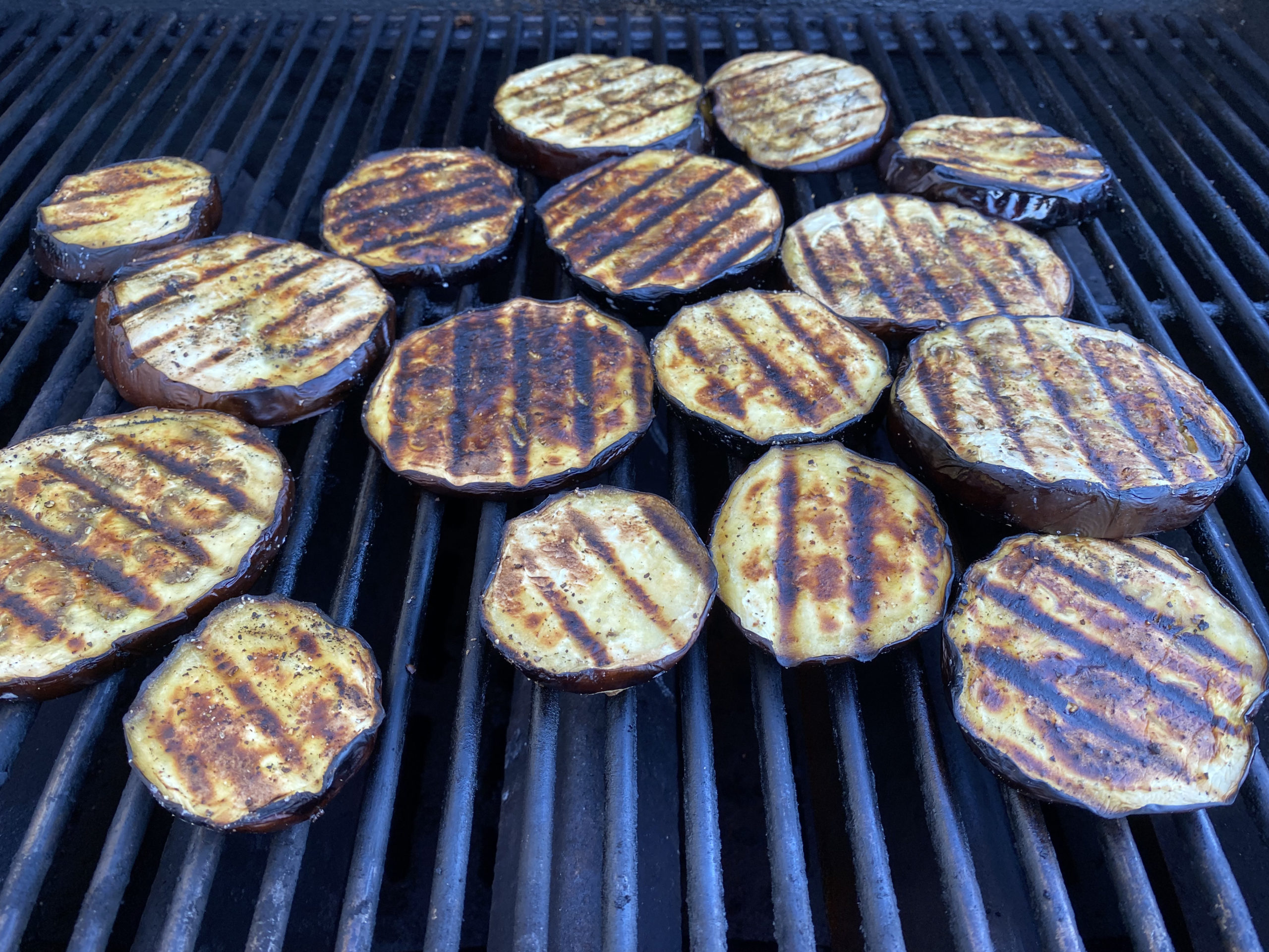 Grill on medium-low heat, placing the eggplant directly onto the grate, 6 minutes first side and 3 minutes second side. Eggplant should be tender but not flimsy.