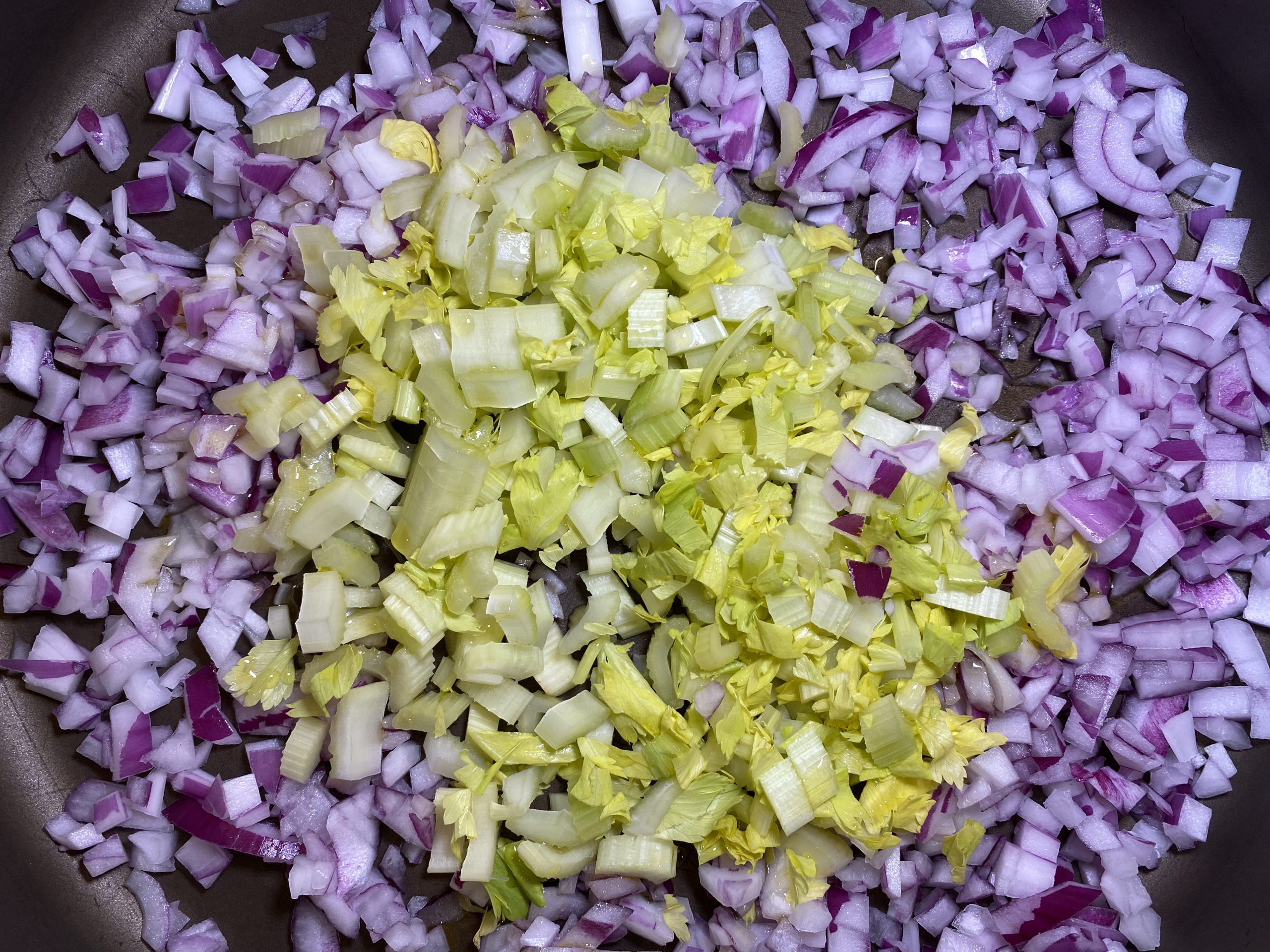 Finely mince the onion, garlic, celery, and tomato using a Ninja food processor. Sauté in olive oil in a frying pan on medium-low heat for 5 minutes.