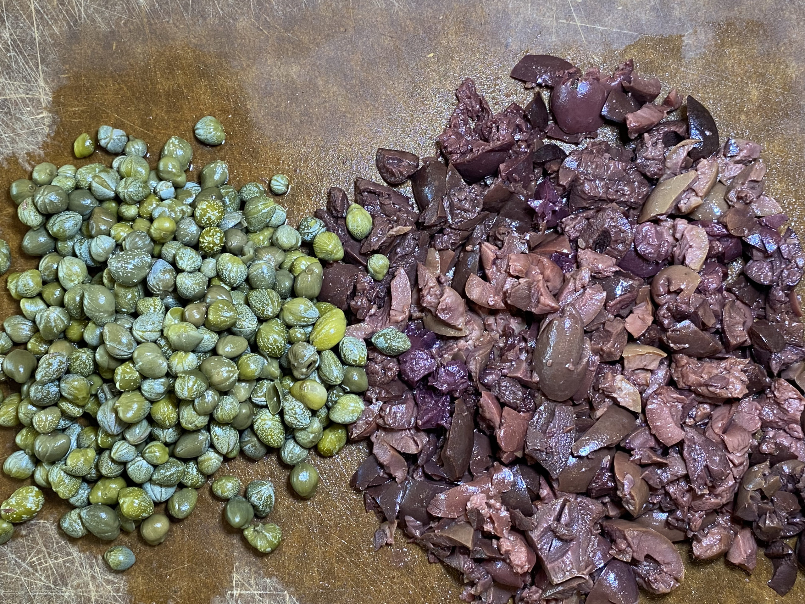 Drain the capers and chop the kalamata olives, removing any pits first. Add to the frying pan and cook for another minute.