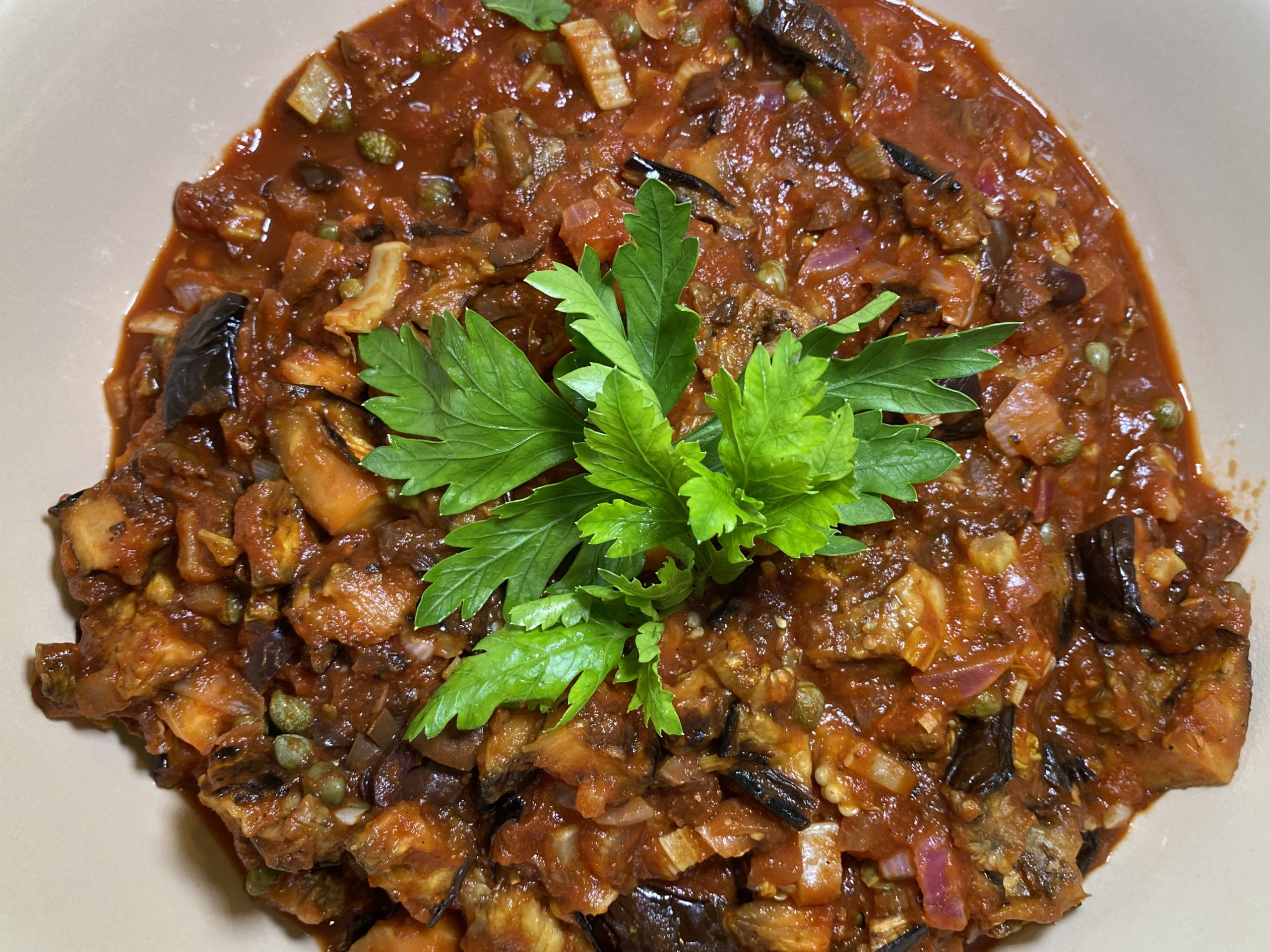 I often make the Sicilian version, using farm-fresh vegetables from Lewis’ Orchard in Darnestown, Maryland. Eggplant is the star, so sourcing the freshest you can find is key.