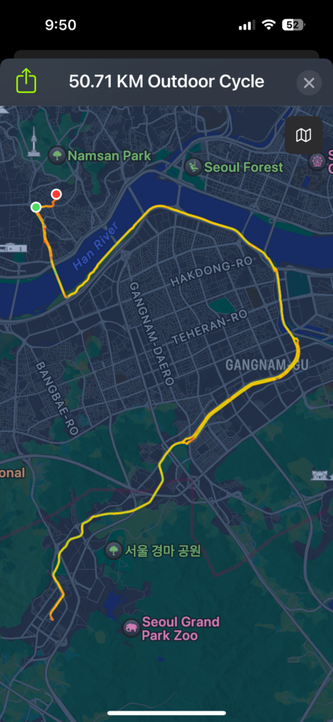 The second day was an adventure on two wheels. With Hans at work, I borrowed his bike so Bernadette and I could embark on a 50-kilometer exploration of Seoul, showcasing the city’s remarkable cycling infrastructure. Starting in her neighborhood, we descended from steep Mount Namsan—the return after 45 kilometers would prove more challenging than the glide down—and crossed the Han River via dedicated bike paths. From there, we connected to trails along the Tancheon and Yangjaecheon streams, marveling at the seamless blend of urban and natural landscapes. It was truly impressive how far we traveled without ever needing to navigate busy city streets—a testament to Seoul’s thoughtful urban planning and commitment to promoting eco-friendly transportation.