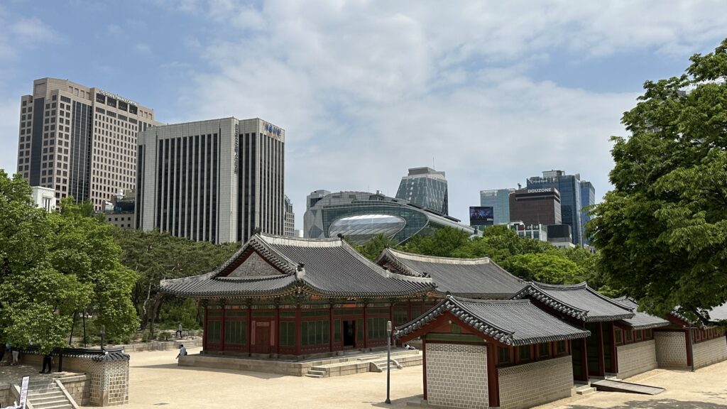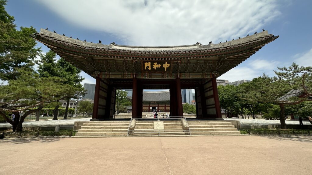 On my final day in Seoul, with a late flight allowing for a bit more exploration, we visited two iconic locations that encapsulate the city’s charm and history. First, we toured Deoksugung Palace, a unique site that blends traditional Korean and Western architectural styles. The palace, once the seat of the Korean Empire, is smaller than the other grand palaces but holds immense historical significance. Originally established as a residence for Prince Wolsan, the palace gained prominence in 1897 when Emperor Gojong proclaimed the Korean Empire and made it his imperial residence. Its name, Deoksugung, translates to “Palace of Virtuous Longevity,” reflecting the hope for stability during turbulent times.