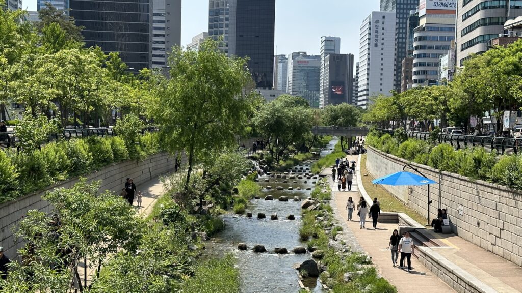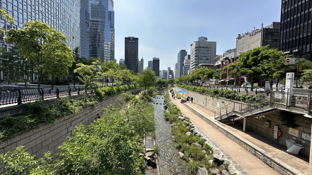 On our way back to Bernadette’s apartment we strolled along Cheonggyecheon Stream, an 11-kilometer-long urban oasis running through the heart of downtown Seoul. The stream, once buried beneath an elevated highway, was restored in the early 2000s as part of an ambitious urban renewal project to transform an eyesore and source of pollution into a beautiful park with health benefits for residents and tourists alike. Today, it’s a peaceful haven with walking paths, cascading waterfalls, and art installations. We strolled along its banks, enjoying the soothing sound of water and the sight of locals and tourists alike relaxing in this revitalized space. The stream’s transformation from neglected infrastructure to a vibrant public space is a testament to Seoul’s commitment to innovation and environmental sustainability.