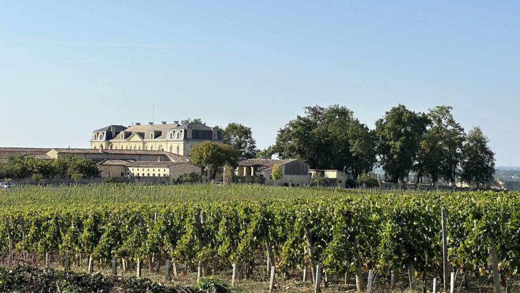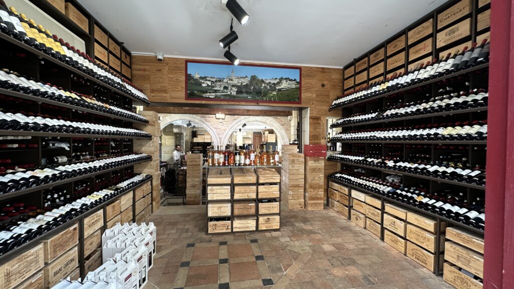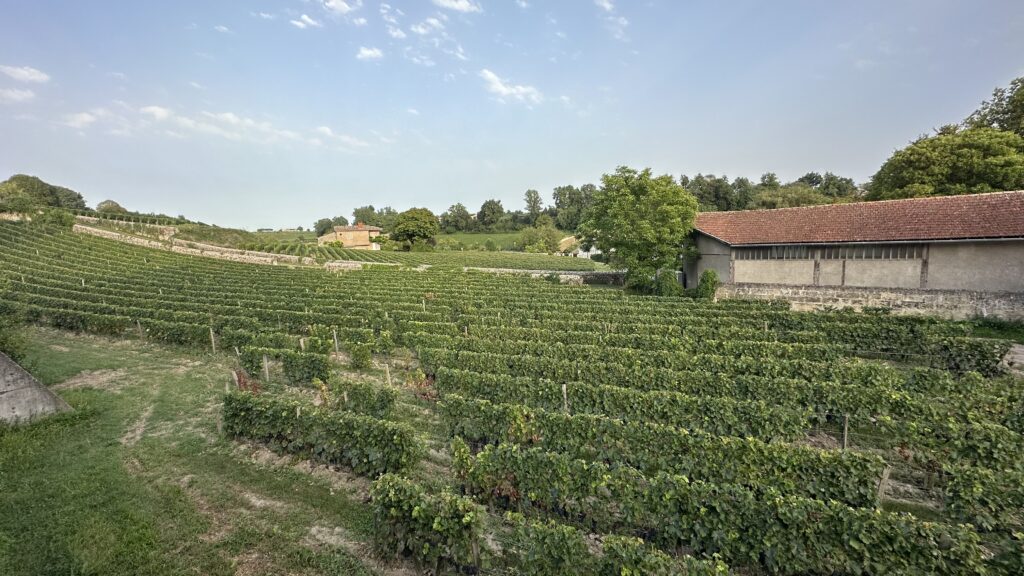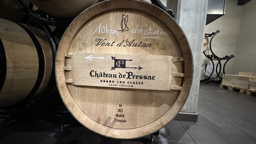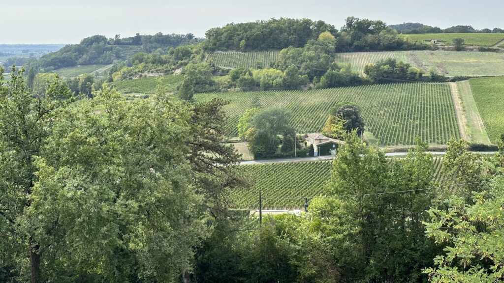 Next, we visited Château de Pressac, a stunning vineyard with historical ties to the Hundred Years’ War. This grand estate, perched atop a limestone plateau, was the site where the French secured their final victory against the English in 1453, marking the end of the conflict. Today Château de Pressac is known for its impressive blend of Merlot, Cabernet Franc, and Malbec, producing bold, well-structured wines. The estate’s underground cellars, carved into the limestone, provide the perfect aging environment, ensuring their wines develop deep complexity. Walking through its picturesque vineyards, enjoying views for miles around, we gained a newfound appreciation for the rich history and meticulous craftsmanship that define this remarkable winemaking region.