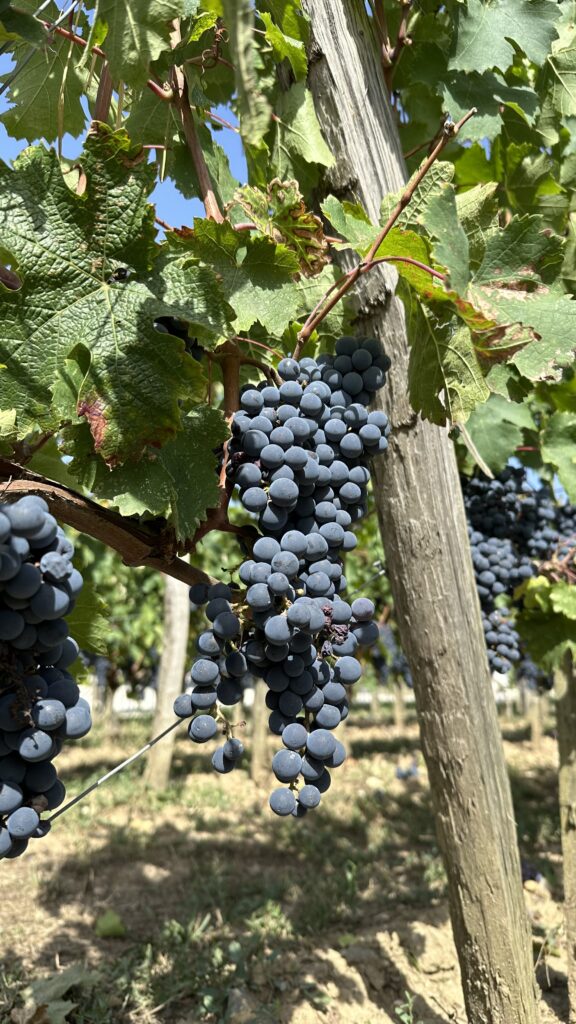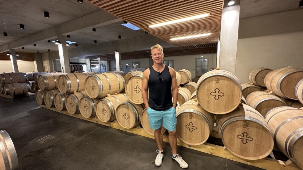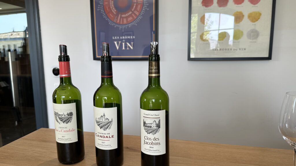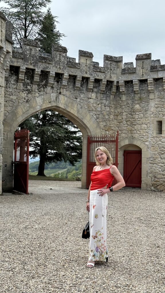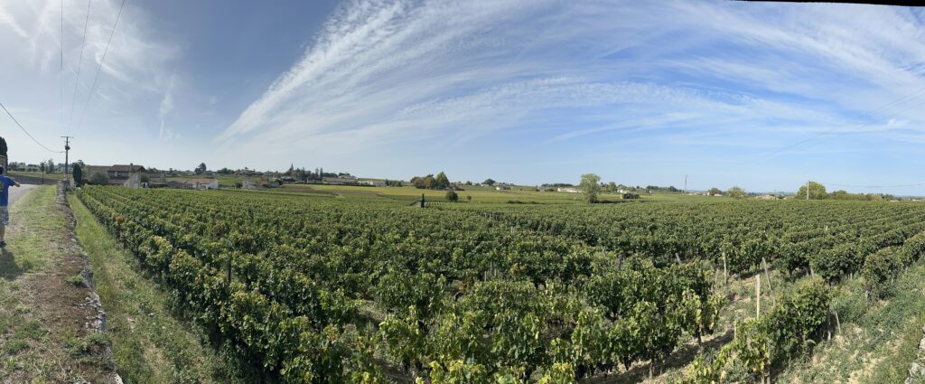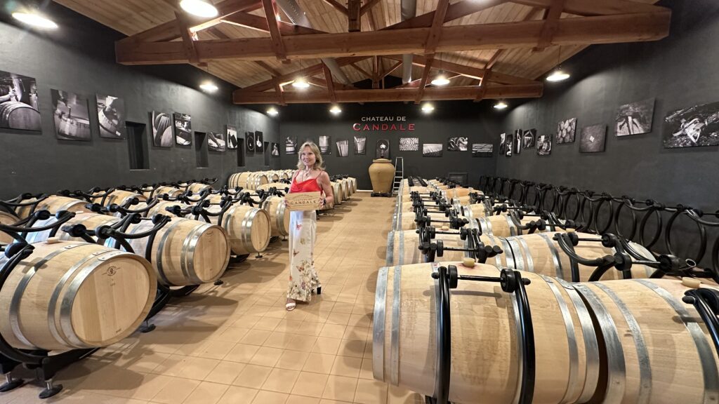 Next, we visited Château de Pressac, a stunning vineyard with historical ties to the Hundred Years’ War. This grand estate, perched atop a limestone plateau, was the site where the French secured their final victory against the English in 1453, marking the end of the conflict. Today Château de Pressac is known for its impressive blend of Merlot, Cabernet Franc, and Malbec, producing bold, well-structured wines. The estate’s underground cellars, carved into the limestone, provide the perfect aging environment, ensuring their wines develop deep complexity. Walking through its picturesque vineyards, enjoying views for miles around, we gained a newfound appreciation for the rich history and meticulous craftsmanship that define this remarkable winemaking region.