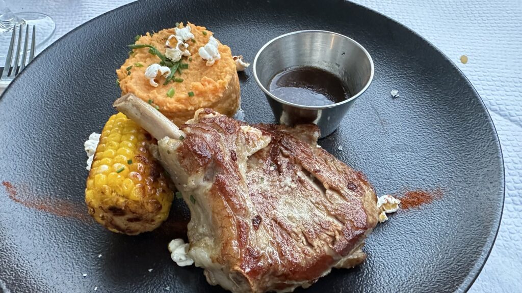 For dinner, we dined under the stars in the charming square of Amelia Canta, savoring the flavors of the region with onglet de boeuf, sauce au poivre, potato cassoulet, and fresh summer corn. The richness of the beef paired perfectly with the boldness of the suggested Saint-Émilion red, while the potato gratins–a staple of French cuisine since the 18th century–and fresh summer corn perfectly complimented the farm-fresh meat.