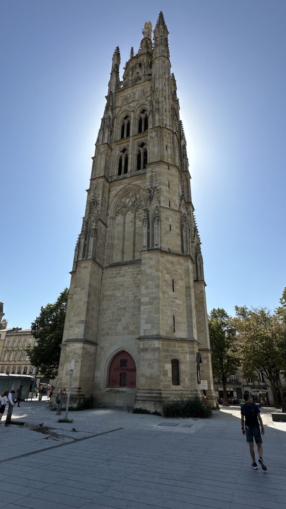 Continuing through the city, we stopped at the Porte Dijeaux, a historic city gate that once marked the entrance to the walled city. Built in the 18th century, this neoclassical gate replaced an earlier medieval structure and served as a symbol of Bordeaux’s transition into a more modern, open city. Today, it remains an important landmark, seamlessly blending with the surrounding elegant architecture and bustling streets. Nearby, the grand Palais Rohan showcased Bordeaux’s administrative elegance, as the palace now serves as City Hall. From there, we climbed the Tour Pey-Berland, offering breathtaking views over the city from its Gothic tower.
