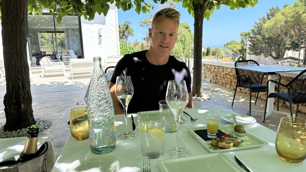 Late afternoon, we left Figueres to return to the coast, arriving at the town of Begur and checking into the “adults only” Hotel Eetu. We did wonder what the qualifier meant when reserving, but, admittedly, the beautiful online photos convinced us to “Book Now” before reading all the fine print. Thankfully, adults only means no kids, not inclusion in an OnlyFans site. The hotel is an Art Deco gem that clings to the cliffs above the secluded beach, Playa Fornells. Eetu’s restaurant offers fresh, local ingredients and Catalan-inspired cuisine with historic mansions, vineyards, and the Mediterranean as its backdrop—honestly I can’t think of a better setting to enjoy a 7-course, chef’s menu paired with cava.