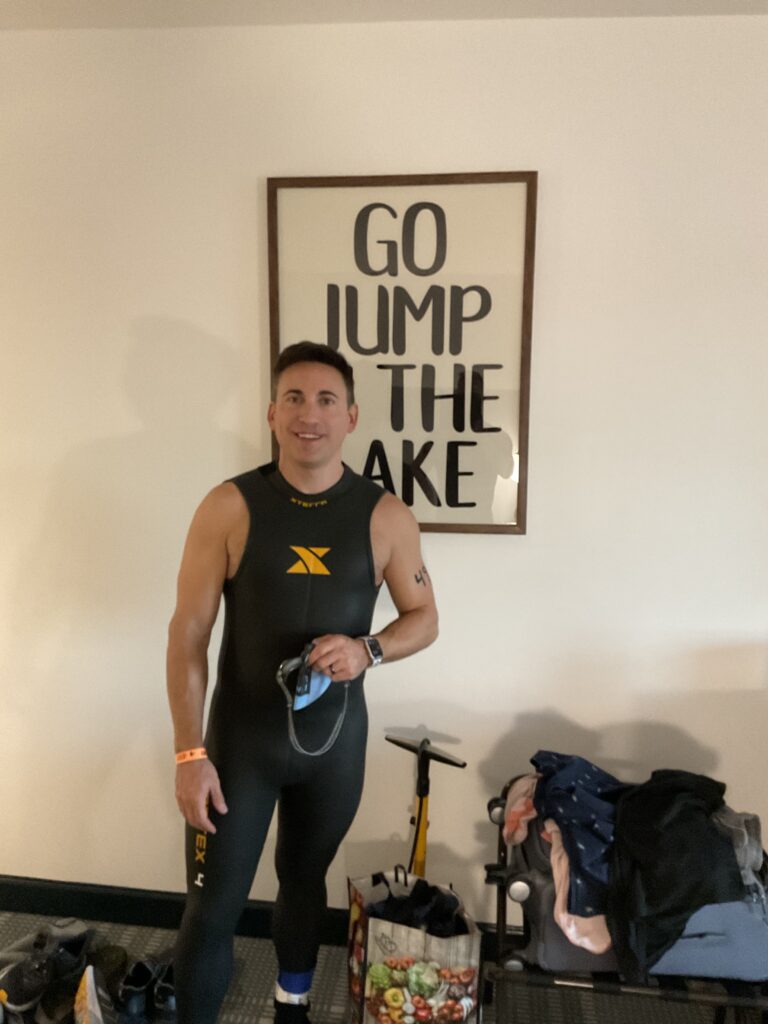 “Okay, we need to rethink our transition setup strategy,” I said, mildly shocked as I checked the weather 5 AM Sunday morning. It was only 42° outside with 20 mph sustained winds. With transition closing an hour before the race, the thought of standing around in a swimsuit in the crisp, wildly blowing wind wasn’t exactly appealing. Thankfully, the transition area was conveniently located in the hotel parking lot, which gave us some unique options.