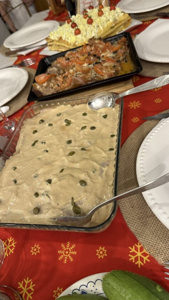 Everyone worked together to prepare a traditional Argentinian Christmas dinner. The menu was elaborate, featuring traditional Argentinian dishes lechón al horno, vitel toné, matambre a la pizza, pionono de jamón y queso, ensalada Waldorf, ensalada de palmitos with jamón y queso, and a classic ensalada caprese.
