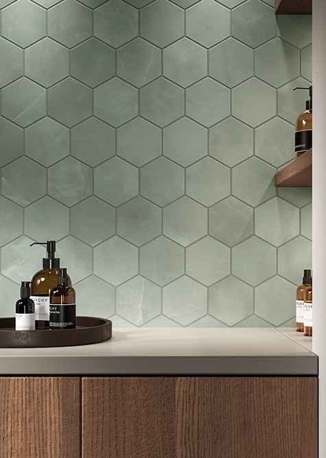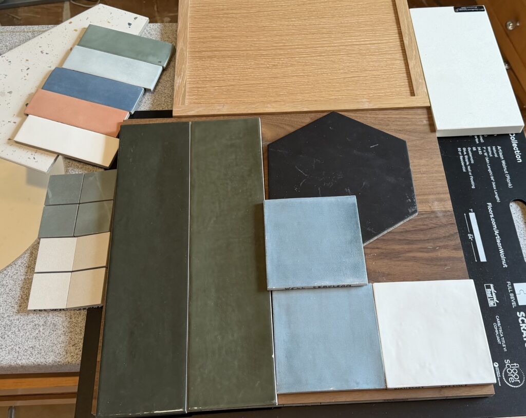 In the bathrooms, color becomes more expressive. Terrazzo and patterned tiles in the first-floor bath reference classic mid-century geometry. The primary bath takes on a spa-like feel, with soft green octagon tile meant to evoke the calm of being among trees. The upstairs guest bath layers blues and whites in hand crafted square tile, designed to feel like passing soft clouds on an otherwise clear sky day.