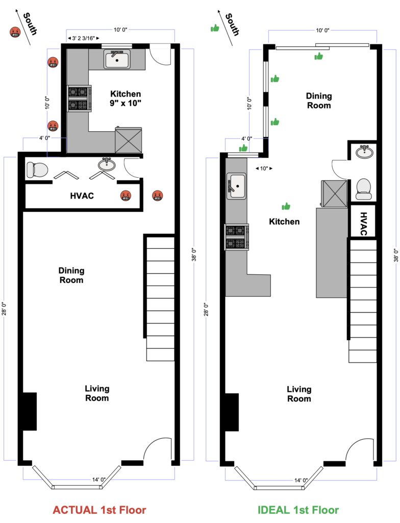 The more expensive—though much needed—change would have been relocating the kitchen to the center of the house. Because the rear of the house faced south, moving the kitchen to the center would have moved light-blocking cabinets into shared interior walls, freeing up valuable exterior walls for additional windows and a large glass slider. Shifting the dining room to the back would have drenched sunlight across the entire first floor.