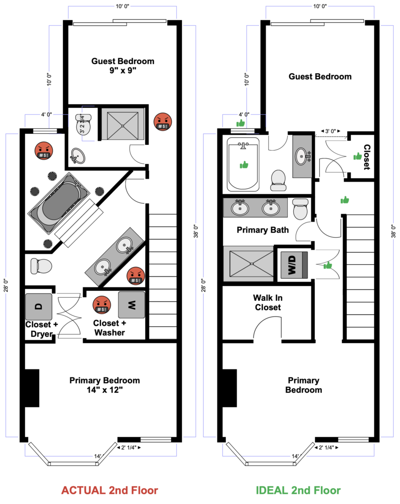 The second floor should have been squared off and equalized. Two bedrooms of comparable size, each with its own properly proportioned bathroom and real closets. No diagonals. No gymnastics required to reach a window. The guest bathroom could have taken advantage of the central window, with a soaking tub and shower combination placed directly beneath it and a proper vanity that allowed guests to spread out their things. The primary bathroom would retain the double sinks but gain a generous walk-in shower, making it far more functional for everyday use. A single, same-sized walk-in closet becomes possible by shifting the door a few inches and eliminating the unnecessary hallway that once cut the space in half.