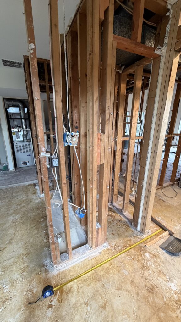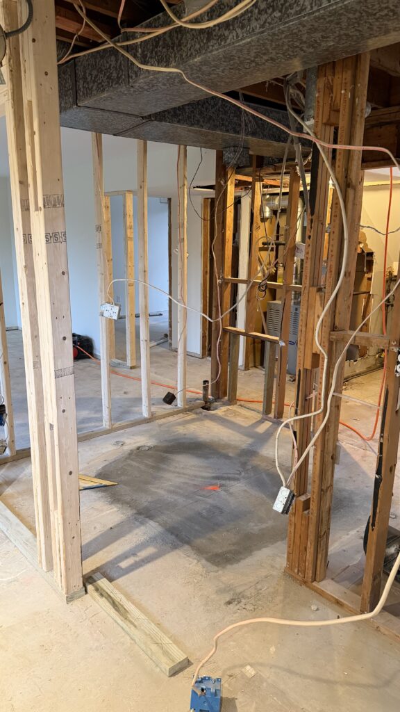 And just like that, it clicked: tearing down interior walls doesn’t just open space—it resets the logic of the house. Lights that were once perfectly centered between walls suddenly weren’t in the open spaces. Fixtures were off by several inches. Switches, still dangling in midair, needed new homes.