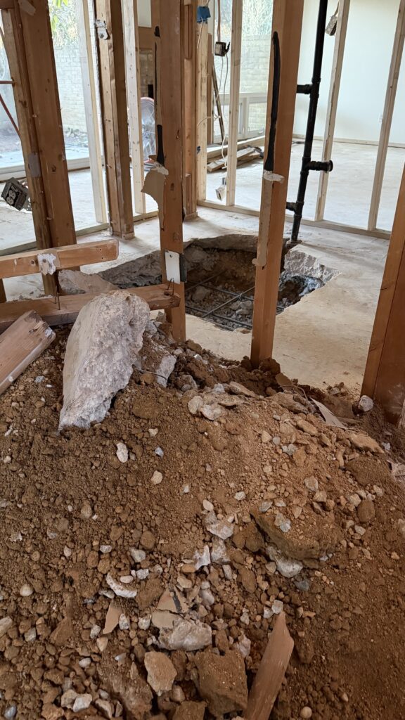 After dozens—and I mean dozens—of “final” steel post positions, we collectively picked a spot, nodded with conviction, and committed. The crew arrived and carved a 4-foot square hole smack in the middle of the house, which—once filled with rebar and concrete—would serve as the footing for the steel post.