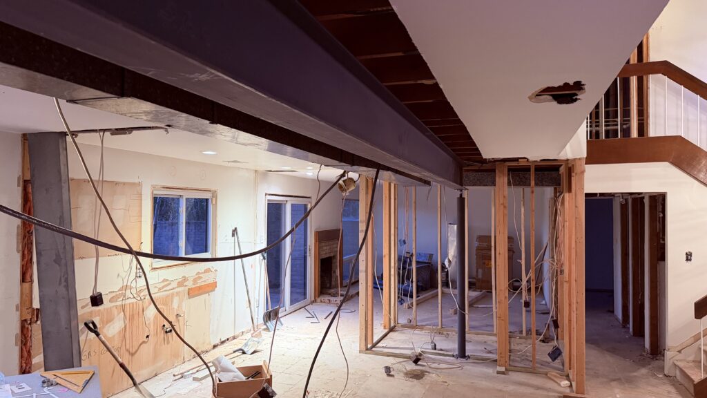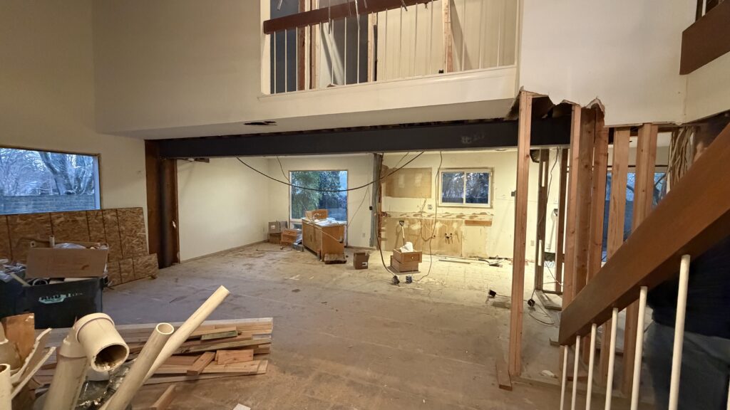The steel beam wasn’t the only structural star of the show. Its quieter sibling—a wood beam opening up the first-floor primary—was installed a week earlier.