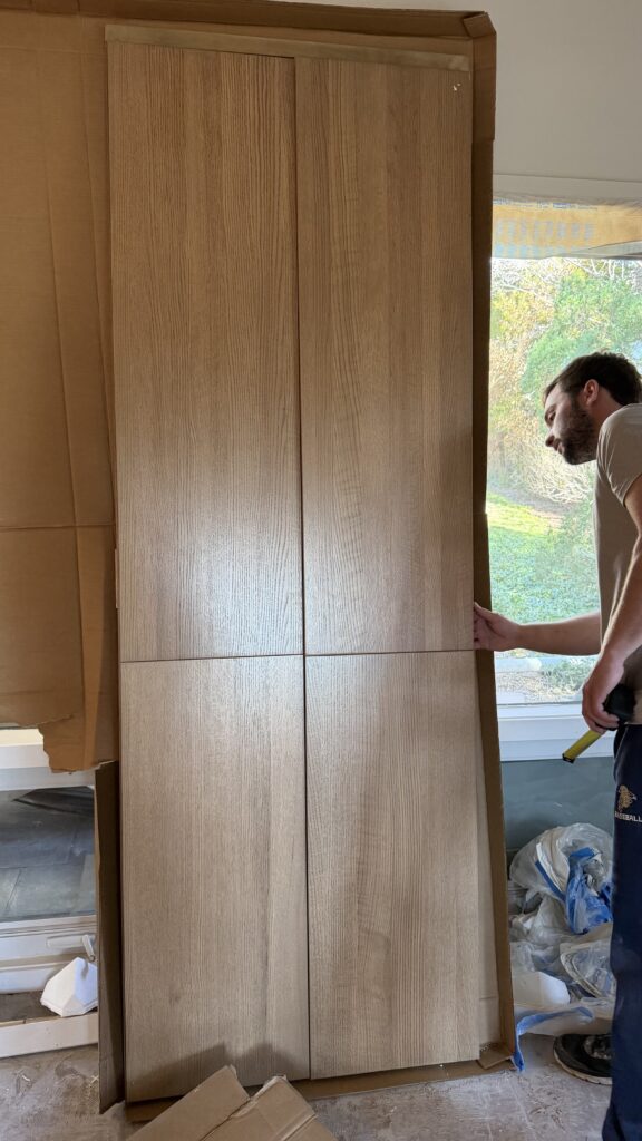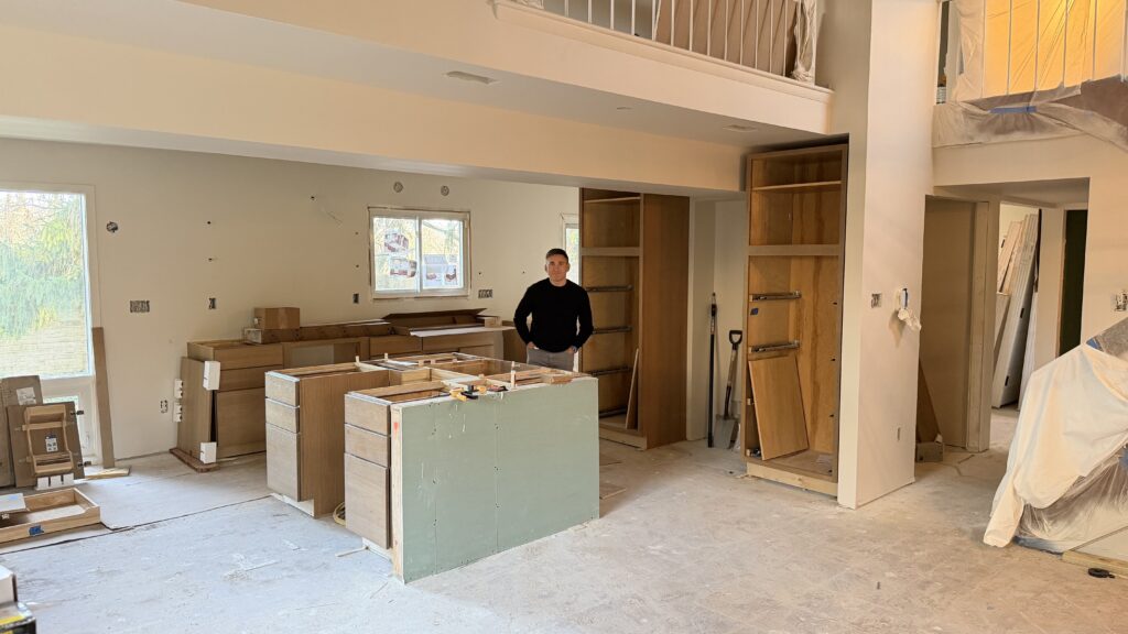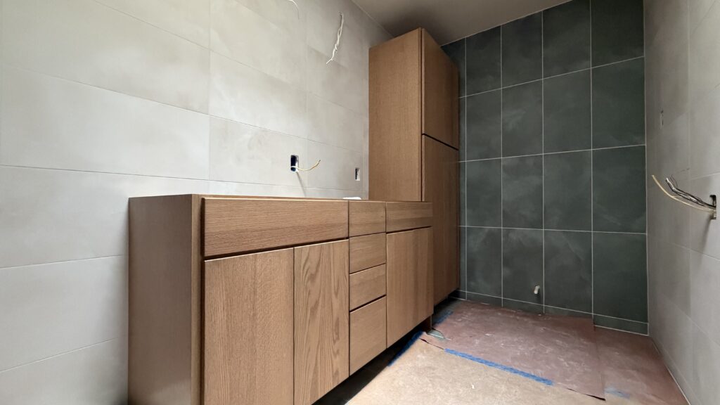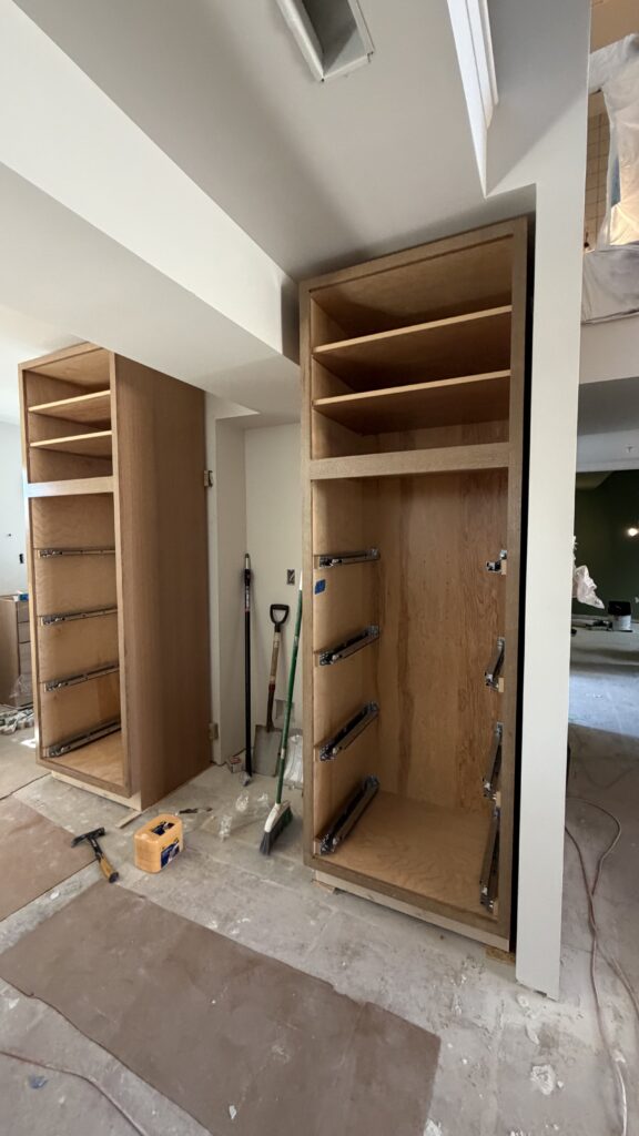 The quartersawn oak cabinets are finally in place, if not fully installed. Even in this halfway state—leveled, measured, and waiting for final adjustments—they already set the tone for the entire kitchen. The wicker finish has the quiet confidence we were hoping for: warm without leaning orange, textured without shouting for attention. And the grain from the quartersawn cut brings a calm rhythm across the cabinet fronts that feels perfectly aligned with the design ideas we laid out back in Chapter 2 – Design With Intention. Nothing ornate. Nothing fussy. Just honest material doing exactly what it should—aging gracefully while letting the architecture carry the conversation.