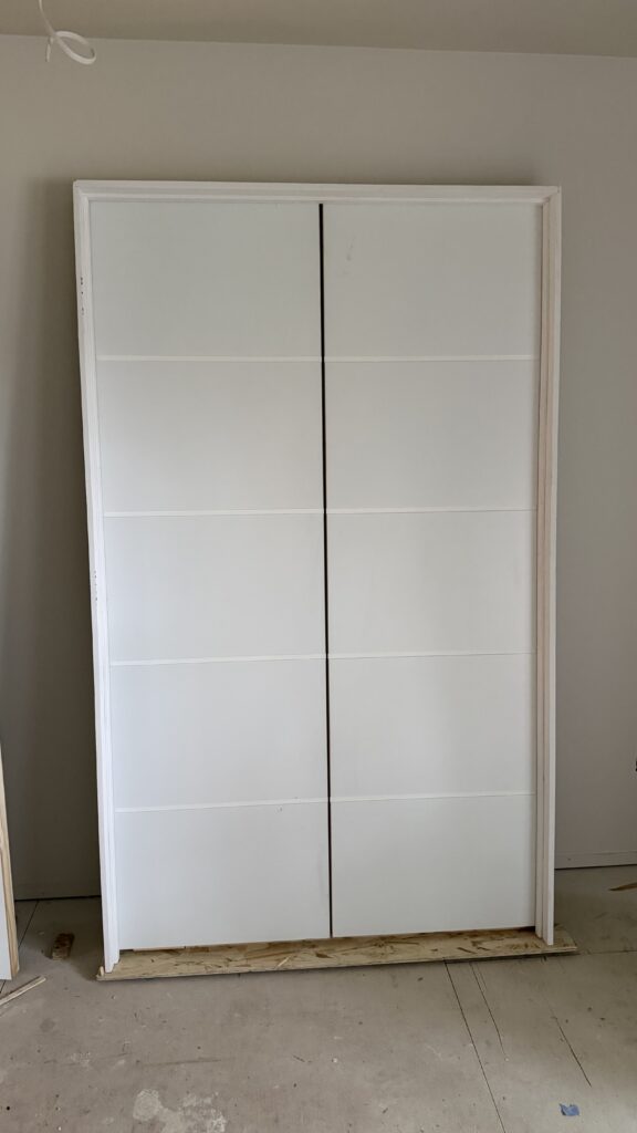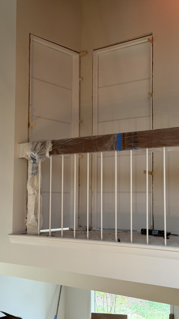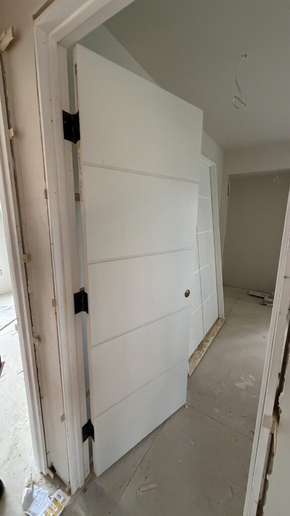 The result is a set of doors that feel less like interior trim and more like structural components. Their sound rating is about as high as you can reasonably achieve in a house, and paired with the soundproofing we installed in the second-floor walls, the bedrooms should be so quiet you could hear a pin drop—assuming anyone still sews. They’re finished with square matte black hardware that keeps the lines crisp and modern, and the doors themselves will be painted Sherwin-Williams Revere Pewter, tying them into the calm, natural palette we set out to achieve in early design decisions.