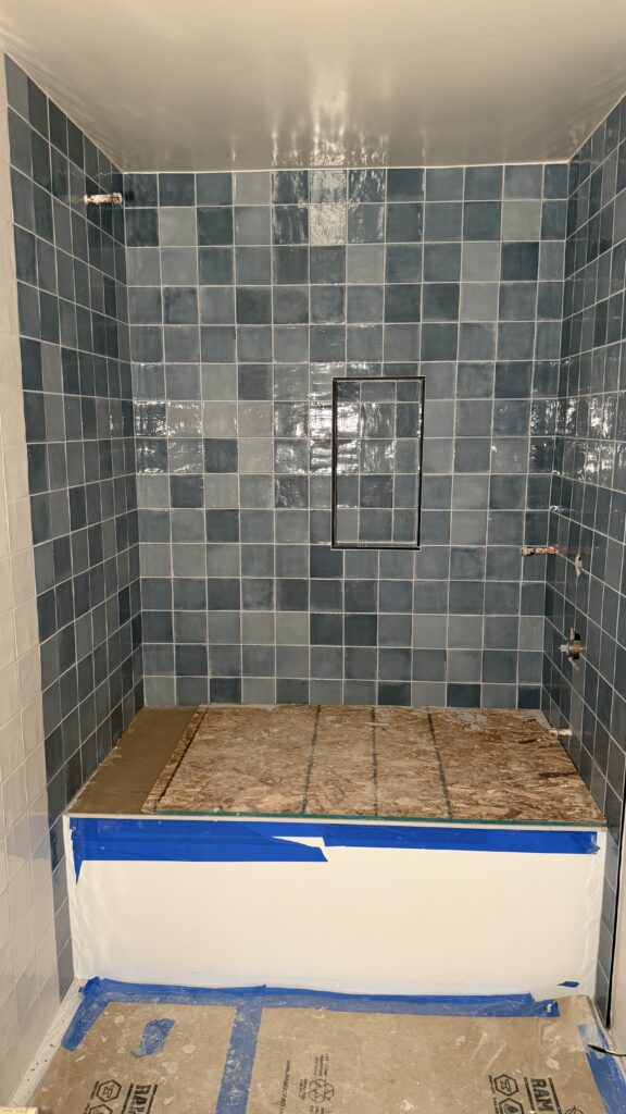 We also intentionally selected a 4×4 tile format, the classic size used in many mid-century bathrooms. It’s a small detail, but one we felt strongly about restoring. The square shape carries a quiet authenticity, which would have been lost with a rectangular subway tile. Paired with the handcrafted finish and the shifting blues, the result is a bathroom that feels both period-appropriate and quietly contemporary—a small room that manages to evoke the feeling of a sky without trying too hard to paint one.