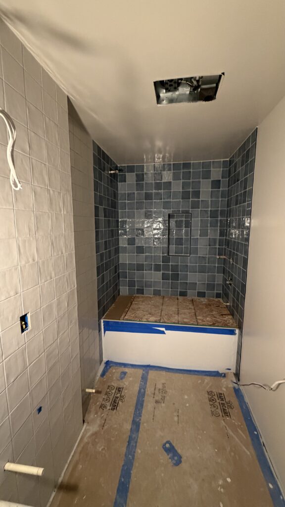 The upstairs guest bathroom has quietly earned a name: The Sky Bath. The idea came together while we were still standing in the tile store. Handcrafted blue tiles anchor the far walls, adding depth to the tub and shower area. Their high degree of color variation shifts from soft slate blues to deeper tones that feel almost like a clear afternoon sky just before sunset. The vanity wall is finished in handcrafted white tiles with a richly textured surface, their subtle irregularities catching the light in a way that feels like clouds drifting towards that blue-sky backdrop. A light blue-gray grout—almost the color of morning fog—ties the tiles together, flowing seamlessly from blue to white so the surfaces feel unified rather than segmented.